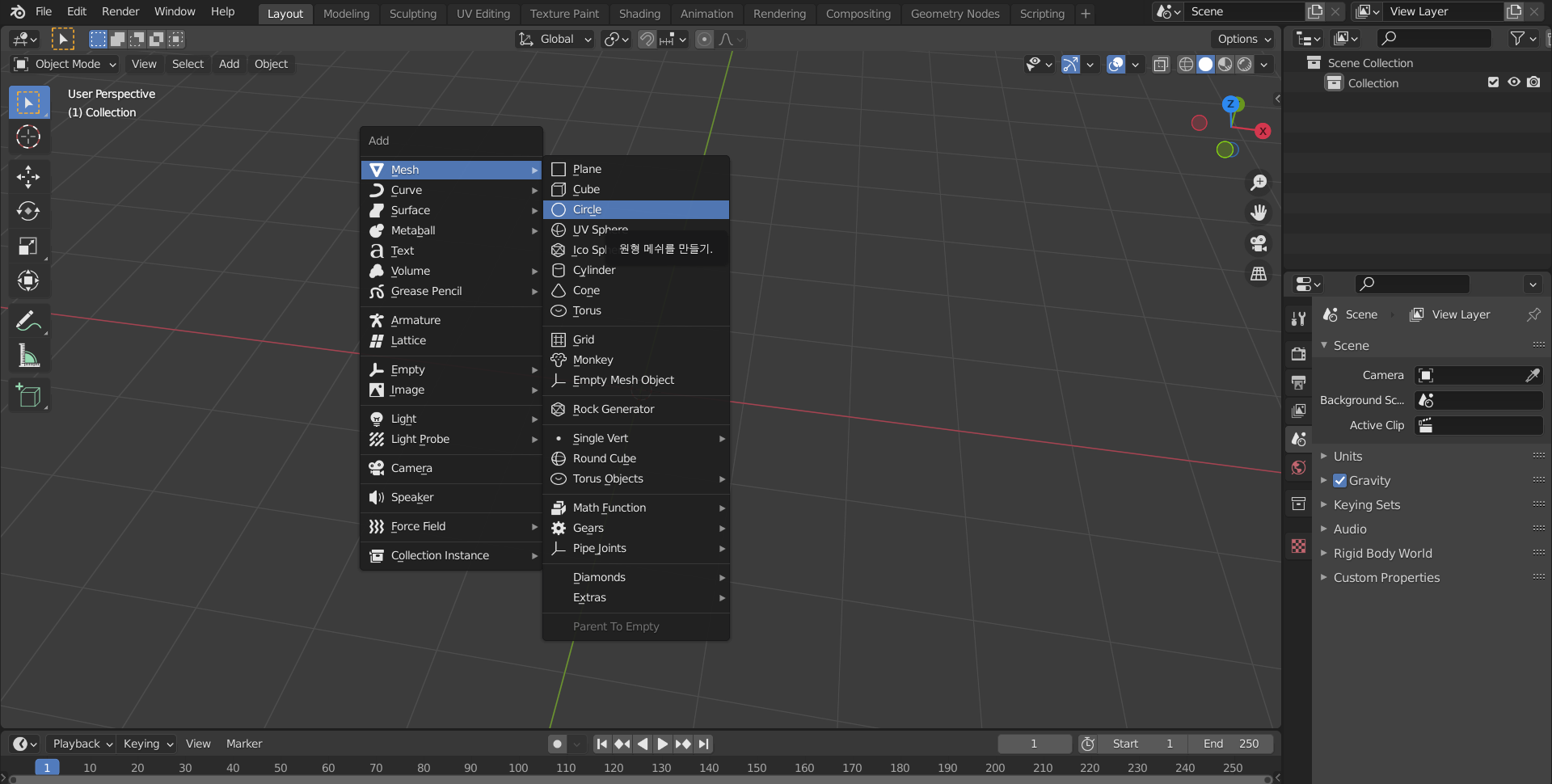 - Object mode에서 Mesh - circle을 추가 한다. (단축키 : Shift + A)