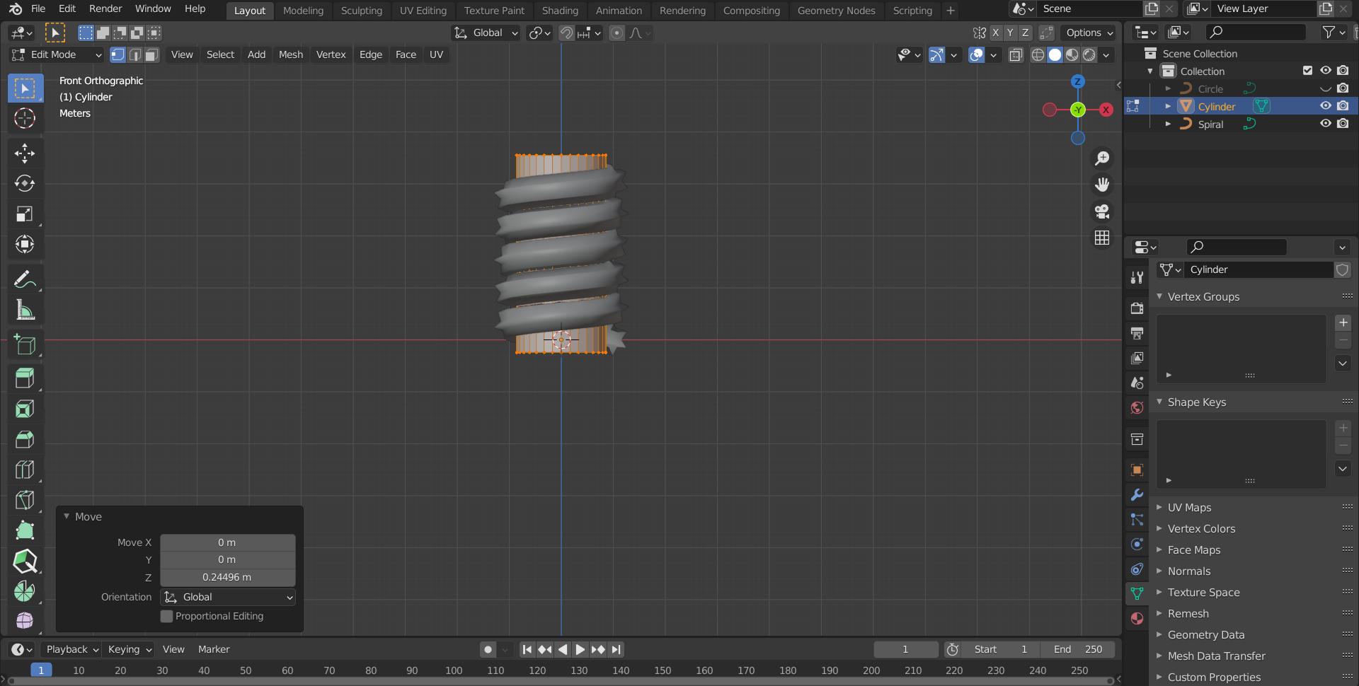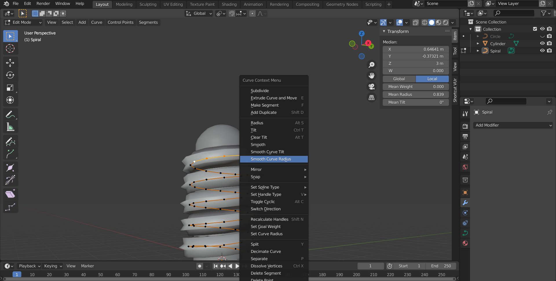 - Curvr Spirals 속성을 조절한다. (예시 - Tums : 5, Steps : 12, Radius : 1, Height : 0.6)
