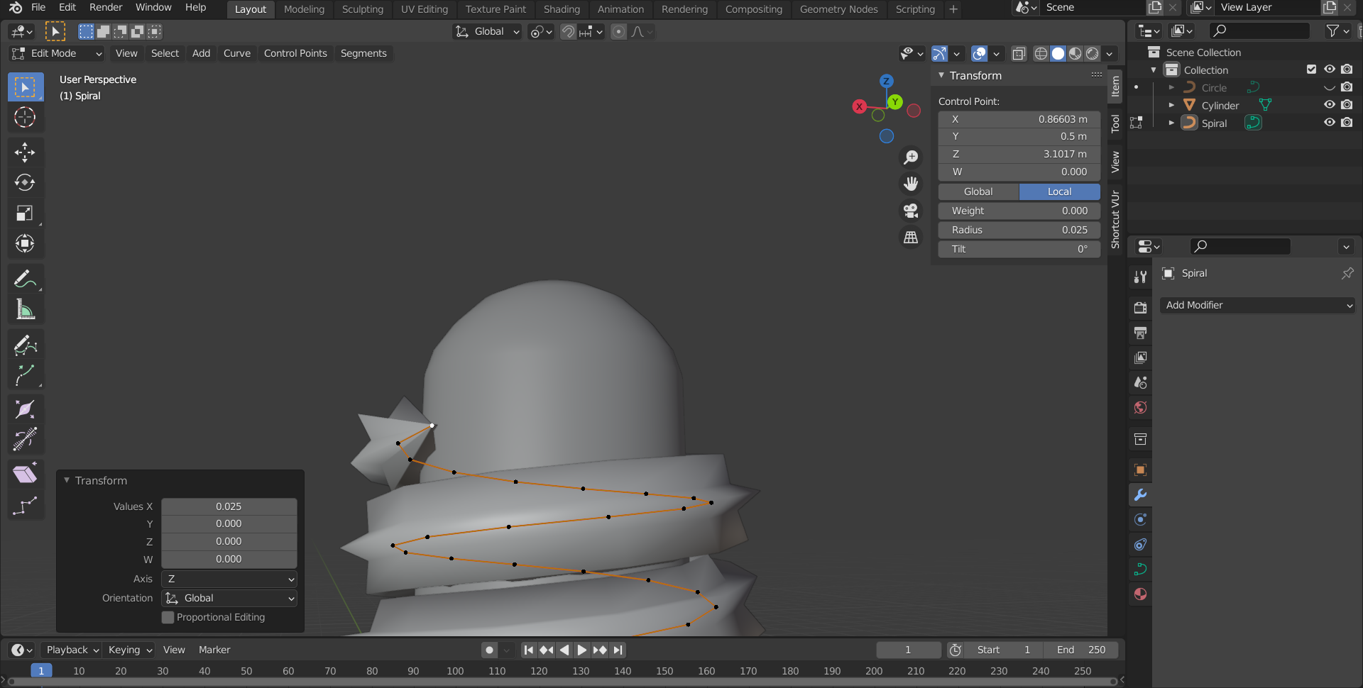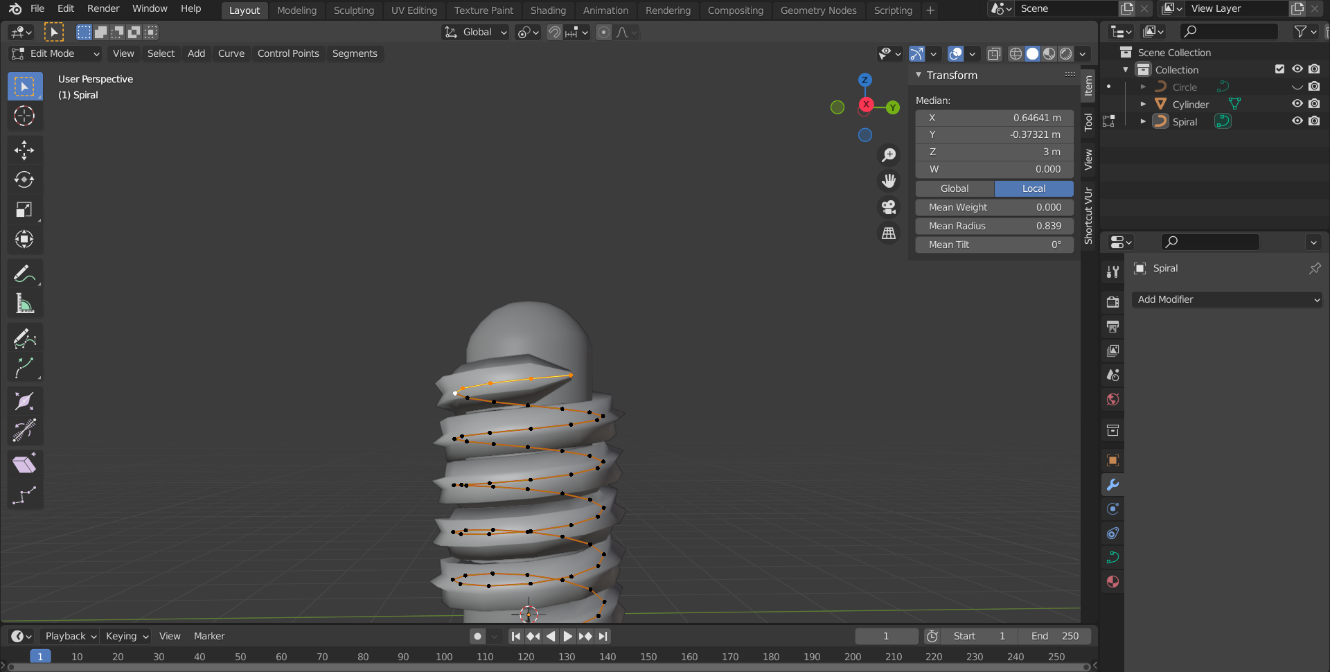 - Object mode에서 Curve Spirals - Archemedian 를 추가한다. (단축키 : Shift + A)