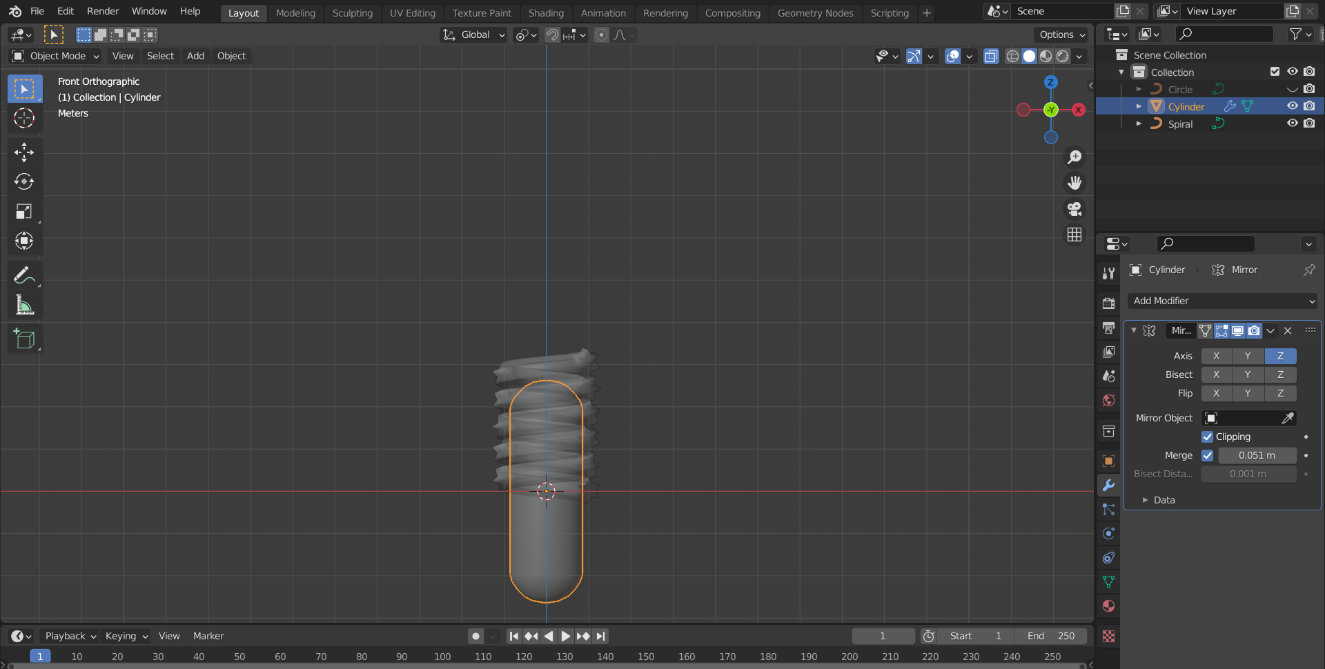 - Mirror modifier를 추가하여 연장시킨다. (Axis : z, Clipping 선택, Merge 거리 조절하기)