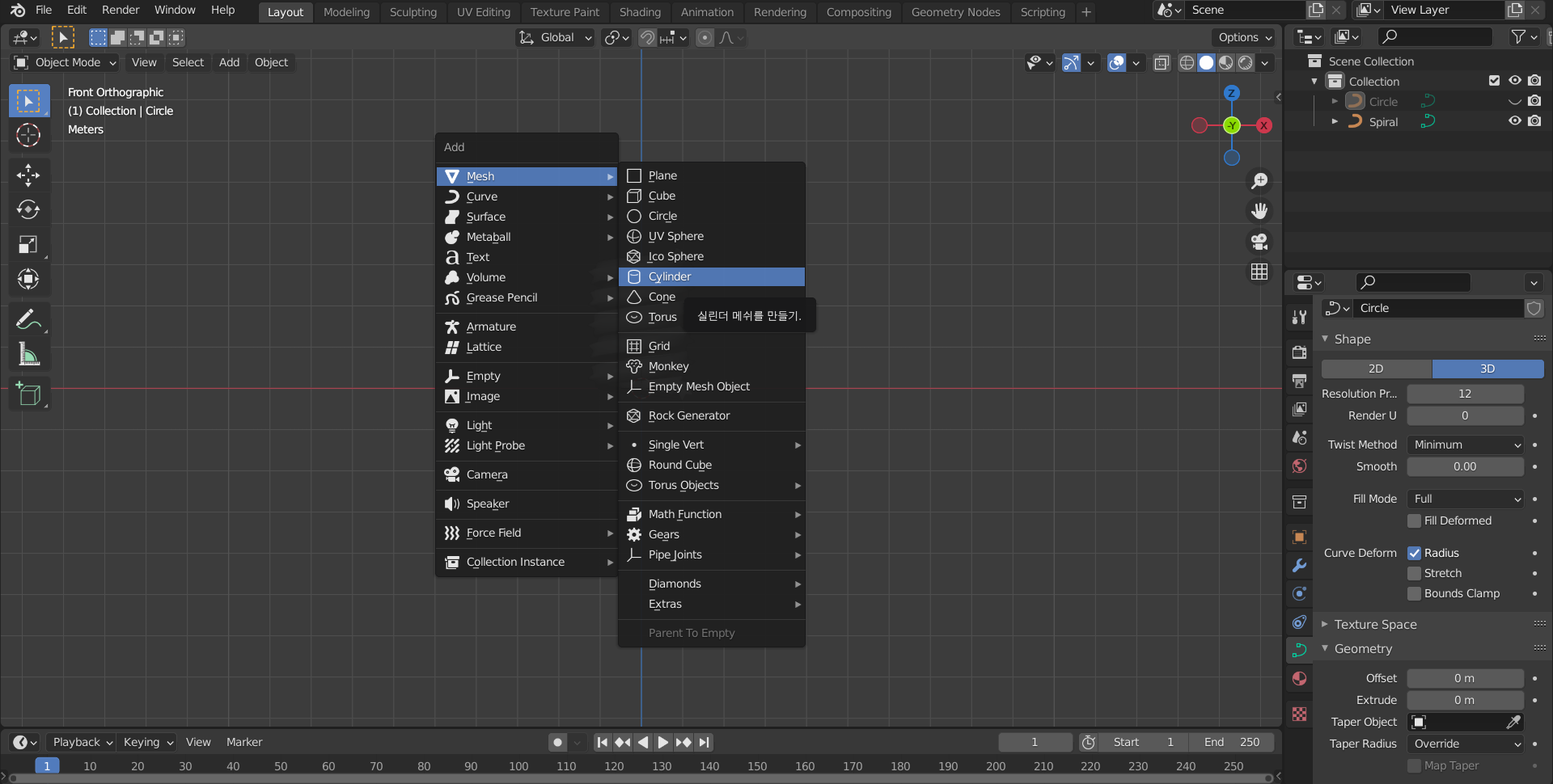 - Object mode에서 Mesh - Cylinder를 추가 한다. (단축키 : Shift + A)