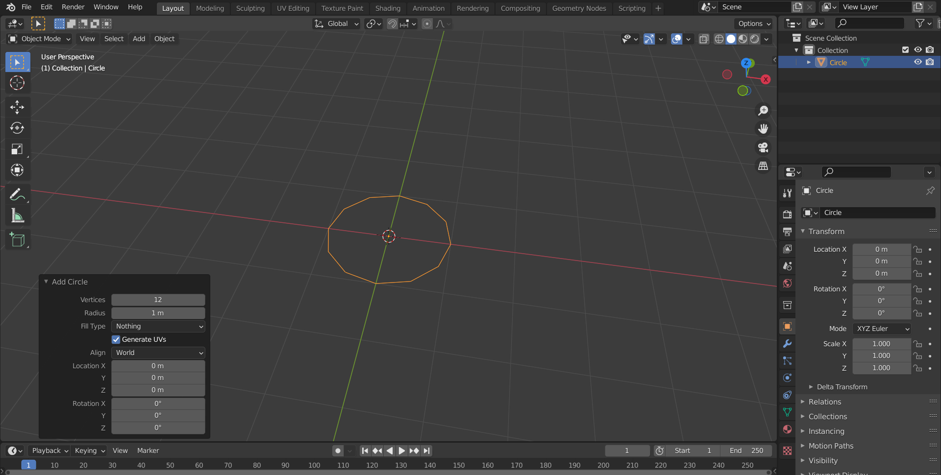 - 추가한 Circle의 설정을 조절한다. (예시 - Vertices : 12로 조절)