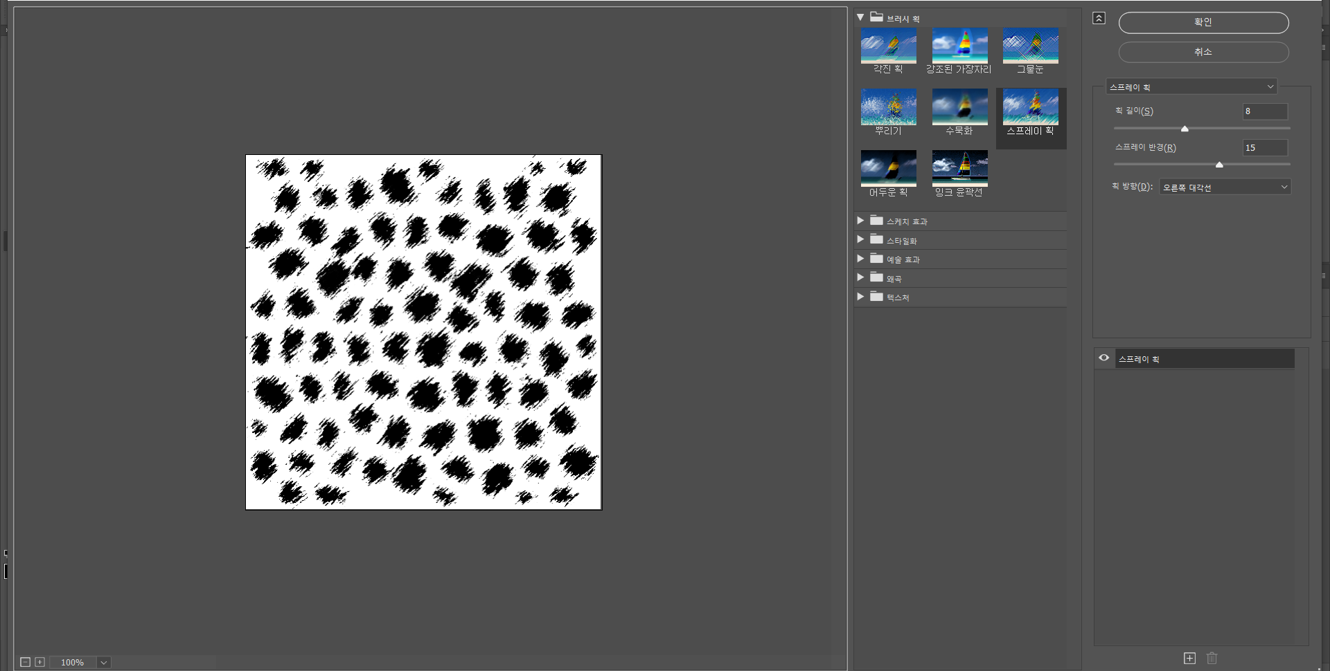 - 브러시 획 - 스프레이 획 선택 (예시 - 획 길이 : 8, 스프레이 반경 : 15, 획 방향 : 오른쪽 대각선)