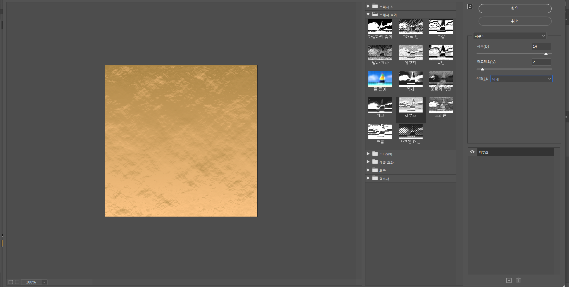 - 첫번째 버전 : 필터 - 필터 갤러리 - 스케치 - 저부도 적용하기 (예시 - 세부 : 14, 매끄러움 : 2)