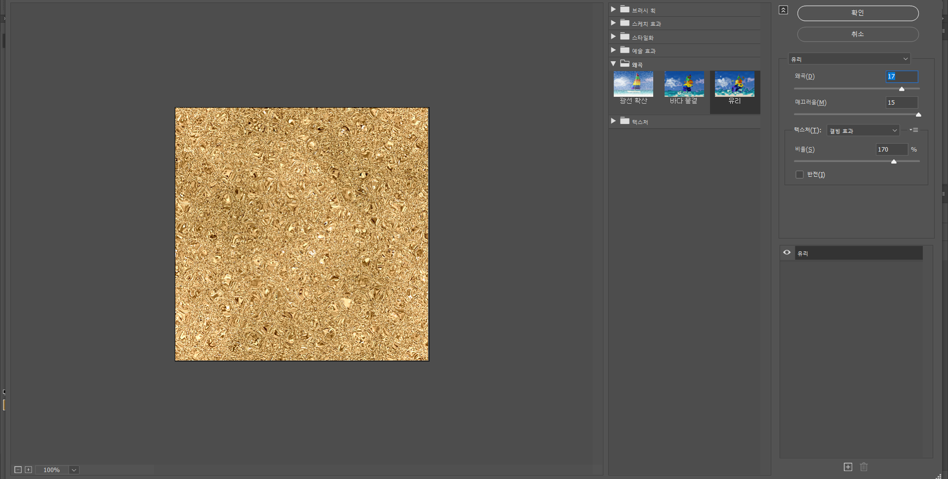 - 세번째 버전-2: 필터 - 필터 갤러리 - 왜곡 - 유리 적용하기 (예시 - 왜곡 : 17, 매끄러움 : 15, 비율 : 170)