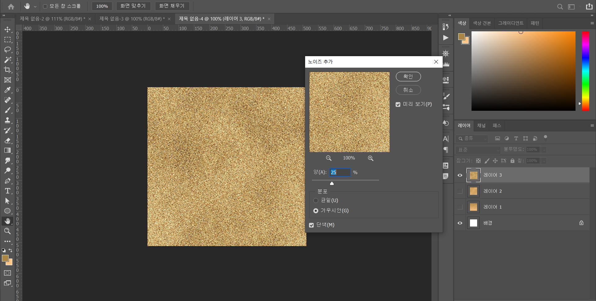 - 세번째 버전-1 : 필터 - 노이즈 - 노이즈 추가 적용하기 (예시 - 양 : 25%, 분포 : 가우시안, 단색 체크)