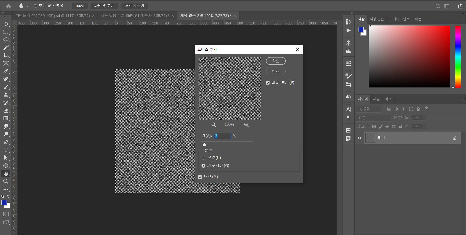 - 상단 필터 - 노이즈 - 노이즈 추가 설정 후 확인 (예시 - 양 :7, 분포 : 가우시안, 단색 선택)
