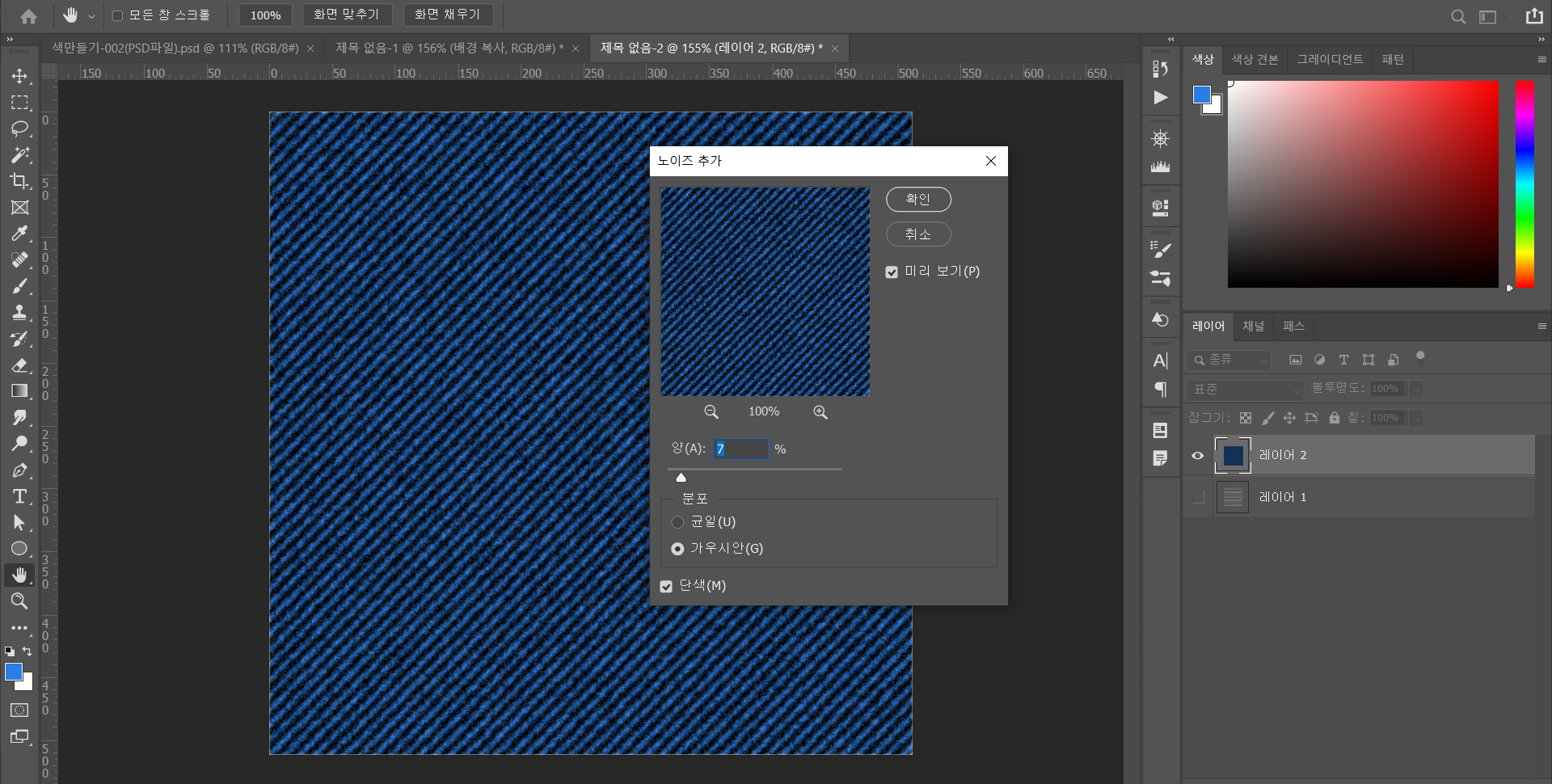 - 상단 필터 - 노이즈 - 노이즈 추가 설정 후 확인 (예시 - 양 :7, 분포 : 가우시안, 단색 선택)