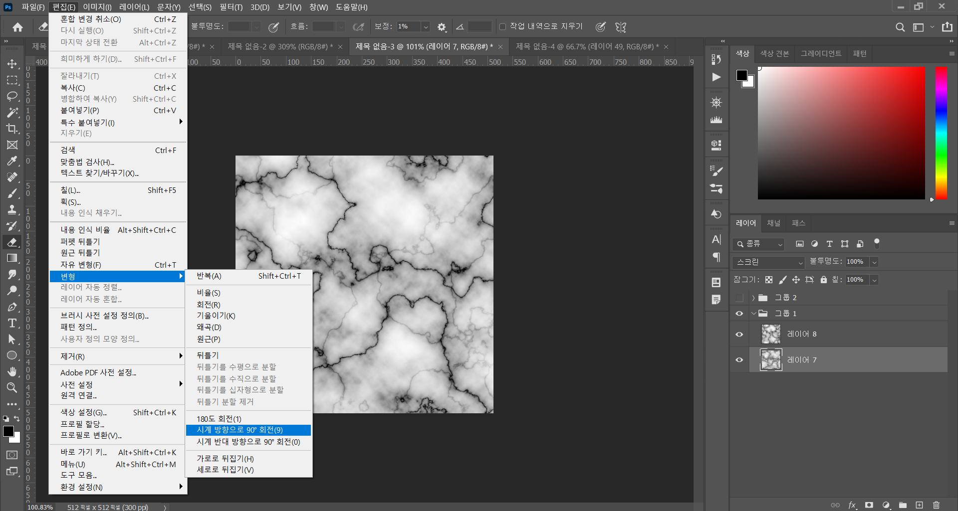 - 하단 레이어에 상단 편집 - 변경 - 시계 방향으로 90도 회전을 적용한다.