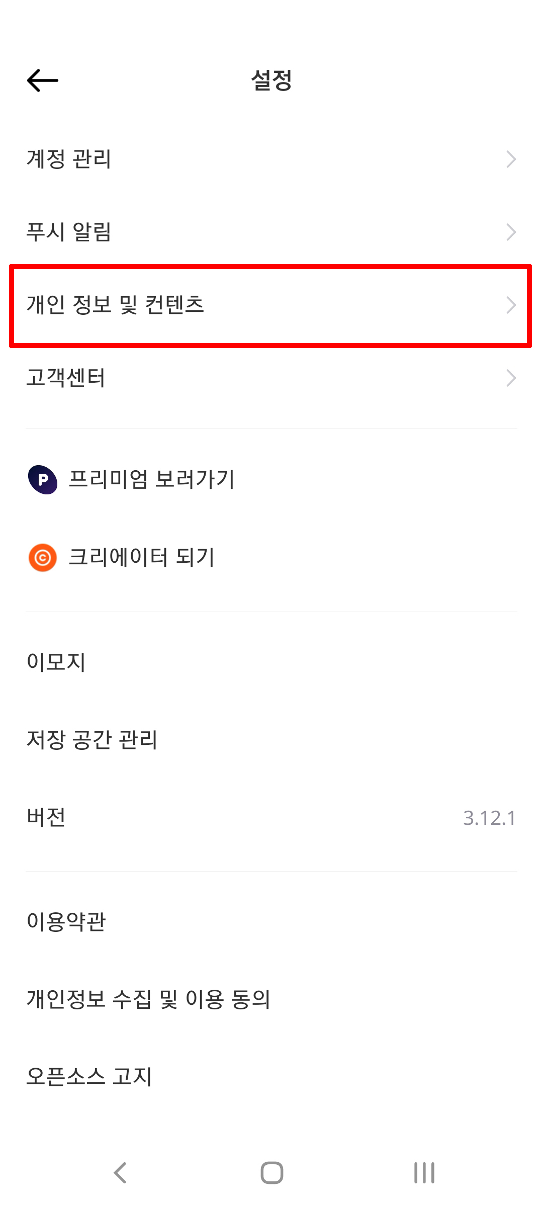 - 개인 정보 및 컨텐츠 클릭